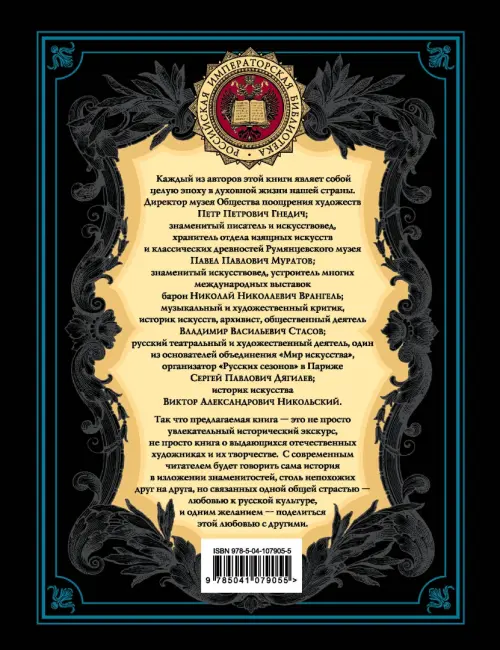 Сегодня трудно представить время, когда история русской живописи считалась предметом несущественным, не стоящим внимания — а ведь это было всего 100 лет назад! Тем более весомыми оказываются работы тех великих исследователей, которые открыли отечественной и мировой публике шедевры русского искусства. Каждый из авторов этой книги являет собой целую эпоху в духовной жизни нашей страны. Директор музея Общества поощрения художеств Петр Петрович Гнедич; знаменитый писатель и искусствовед, хранитель отдела изящных искусств и классических древностей Румянцевского музея Павел Павлович Муратов; знаменитый искусствовед, устроитель многих международных выставок барон Николай Николаевич Врангель; музыкальный и художественный критик, историк искусств, архивист, общественный деятель Владимир Васильевич Стасов; русский театральный и художественный деятель, один из основателей объединения "Мир искусства", организатор "Русских сезонов" в Париже Сергей Павлович Дягилев; историк искусства Виктор Александрович Никольский. Так что предлагаемое издание — не просто книга, увлекающая в мир выдающихся отечественных художников и их творчества, не просто интересно изложенная история русской живописи. С современным читателем будет говорить сама история в изложении знаменитостей, столь непохожих друг на друга, но связанных одной общей страстью — любовью к русской культуре, и одним желанием — поделиться этой любовью с другими.