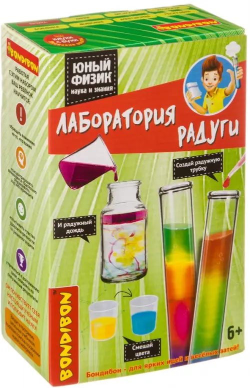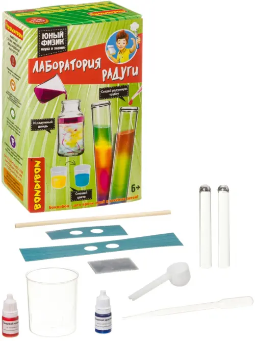 Набор для опытов "Лаборатория радуги" из серии "Японские опыты. Науки с Буки" позволит сделать юным ученым первые веселые открытия: посмотреть, как свет проходит через воду, образуя радугу, провести эксперименты по смешиванию жидкостей с разной плотностью, создать радужное колесо.