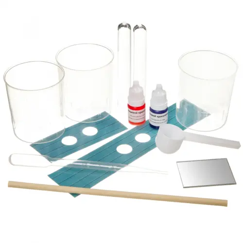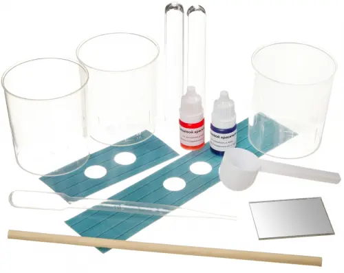Состав набора: ложка, пипетка, 3 мерных стакана, 2 пробирки, краситель 3 штуки, палочка для размешивания, подставка для пробирок, пластиковое зеркало, инструкция.