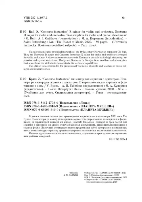 В данное издание вошли два произведения норвежского композитора XIX века Уле Булля. Это ноктюрн ре мажор для скрипки с оркестром (переложение для скрипки и фортепиано) и скрипичный концерт ми минор, Concerto fantastico. Концерт из трех частей для скрипки с оркестром ми минор, отличает высокая виртуозность, выразительная мелодика и строгая форма. Лиричный ноктюрн ре мажор представляет собой прекрасную кантиленную пьесу, позволяющую скрипачу продемонстрировать также и свои технические возможности.