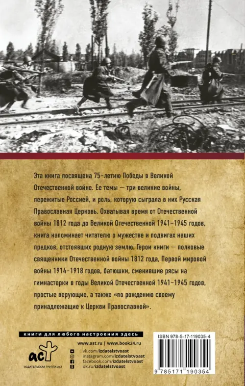 Эта книга посвящена 75-летию Победы в Великой отечественной войне. Ее темы — три великие войны, пережитые Россией, и роль, которую сыграла в них Русская Православная Церковь. Охватывая время от Отечественной войны 1812 года до Великой Отечественной 1941–1945 годов, книга напоминает читателю о мужестве и подвигах наших предков, отстоявших родную землю. Герои книги – полковые священники Отечественной войны 1812 года, Первой Мировой войны 1914–1918 годов, батюшки, сменившие рясы на гимнастерки в годы Великой Отечественной 1941–1945 годов, простые верующие, а также «по рождению своему принадлежащие к Церкви православной». Книга допущена к распространению Издательским Советом Русской Православной Церкви.