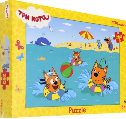 Пазл "Три кота" состоит из 260 деталей и основан на историях из любимого детского мультфильма. На этот раз Коржик, Карамелька и Компот отправились купаться в море. Они играют в мяч, а на берегу их ждут папа и друг Нудик.
