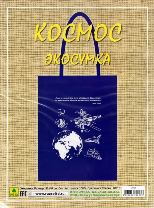 Модная сумка для увлеченных астрономией молодых людей от российского издательства "Руз Ко". Изображено космическое пространство, сопровождаемый известной фразой С. Хокинга: "Если понимаешь, как устроена Вселенная, то некоторым образом можешь ею управлять". Материал хороший, 100% хлопок. Удобного формата для хозяйственных целей. ...