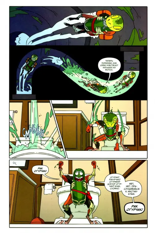 Встречайте комикс про величайшего (пусть он и размером с огурчик) героя поп-культуры! В этом переосмыслении Рик попытается спастись с сеанса семейной терапии с помощью фруктовой пушки (да, огурчики — это фрукты)! Наверное, застрелиться из неё — не самая гениальная идея Рика, учитывая, как плохо для него всё обернулось...