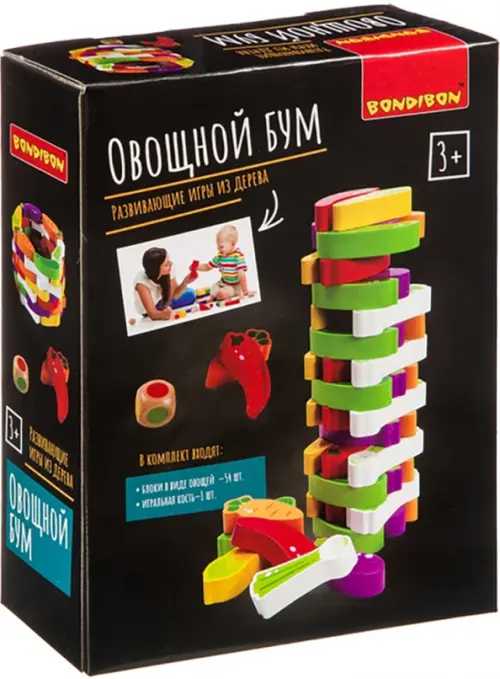 С помощью настольной игры "Овощной бум" ваш малыш начнёт познавать мир природы, знакомиться с различными видами овощей, одновременно развивая навыки восприятия основной цветовой гаммы. Данная игра способствует развитию зрительно-моторной координации движения, познавательных способностей, быстроты реакции, концентрации внимания, пространственного мышления. Помимо выполнения основной задачи игры, заключающейся в строительстве "овощной башни" в соответствии с описанными ниже правилами, ваш ребёнок сможет также самостоятельно использовать "овощи" и для других игр по своему усмотрению (например, имитация приготовления еды и непосредственно самой трапезы и др.). Веселое и полезное времяпровождение гарантировано!