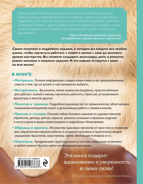 Новая книга серии "Новейшая энциклопедия рукоделия" с легкостью решит все эти проблемы. В подробных, отлично проиллюстрированных мастер-классах авторы расскажут и покажут, как выбрать кожу или мех, сориентируют в приобретении нужных инструментов, помогут разобраться в море фурнитуры, научат правильно отрезать, сшить, подшить или создать элегантный чехол для телефона, браслет или даже сумку. Подшить рукава шубы, поставить аккуратную заплатку, и многое-многое другое! Книга очень практична, но при этом будит фантазию и побуждает к творчеству. Кто знает, может из-под ваших рук выйдут оригинальные игрушки или даже одежда. В любом случае бесценные и редкие навыки останутся с вами на всю жизнь!