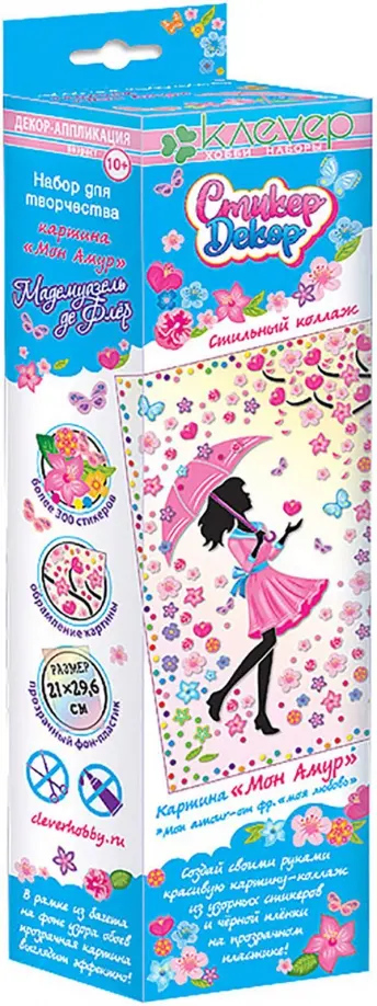 Картина "Мон Амур" серии "Мадемуазель де Флёр" с необычным и полным шарма нежным персонажем увлечет не только подростков старше 10 лет, но и взрослых. Создание картины с мечтательной девушкой под зонтом в облаке из розовых цветов сакуры будет не сложна в исполнении: на прозрачный пластик по шаблону или по вкусу наклеиваются детали силуэта девушки, детали зонтика, разнообразные цветочные стикеры из плёнки и самоклейки. Легкость работы и прекрасный результат доставят радость и удовольствие!