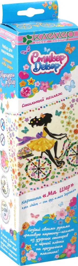 Комплектация: детали из цветной самоклейки, схема, прозрачный пластик, инструкция на упаковке. Картина "Ма Шер" серии "Мадемуазель де Флёр" с необычным и полным шарма нежным персонажем увлечет не только подростков старше 10 лет, но и взрослых. Создание картины с озорной девушкой на прогулочном велосипеде в окружении ярких цветов будет не сложна в исполнении: на прозрачный пластик по шаблону или по вкусу наклеиваются детали силуэта девушки на велосипеде, разнообразные цветочные стикеры из плёнки и самоклейки. Легкость работы и прекрасный результат доставят радость и удовольствие!