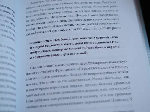 Родительская опека часто мешает ребенку не только понять себя и проявить талант, но и элементарно раскрыть свой потенциал в учебе, спорте и повседневных делах. Постепенно, от главы к главе, шаг за шагом авторы подводят нас к мысли: даже если вам кажется, что ваш ребенок не способен принять ни одного правильного решения (или даже имеет особенности — СДВГ, РАС) — нужно дать ему шанс. Для этого они предлагают в конце каждой главы конкретные шаги-упражнения, которые можно использовать уже сегодня вечером.