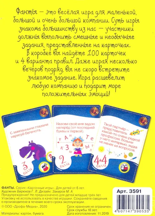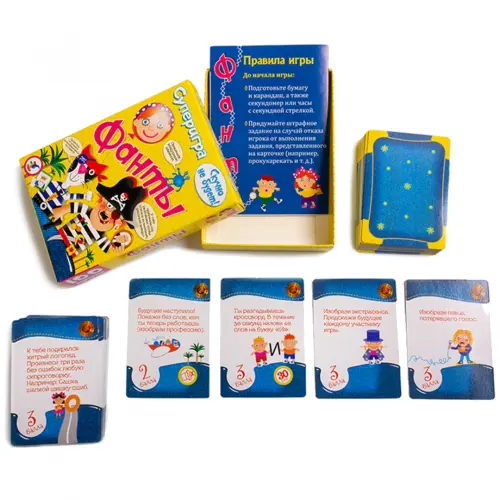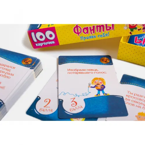 В коробке вы найдёте 100 карточек и 4 варианта правил игры в фанты, классические и не очень. Тяните карту, выполняйте задание, веселитесь от души!
