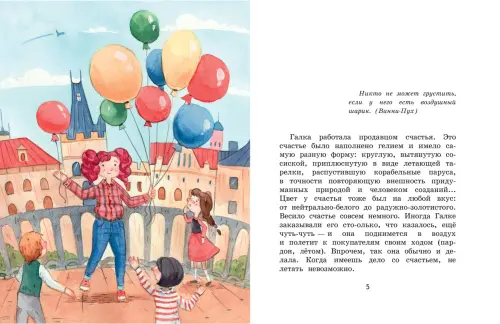 Книга написанная для детей,но которая должна понравиться и взрослым.В относительно не большой книге,поднимаются вопросы,дружбы,взаимопомощи, одиночества,желания жить.Благодаря простым воздушным шарикам,у людей поднимается настроение и даже,как не странно меняются жизнь! В книге есть выражения,которые достойны записи в цитатник.Рекомендую к покупке!