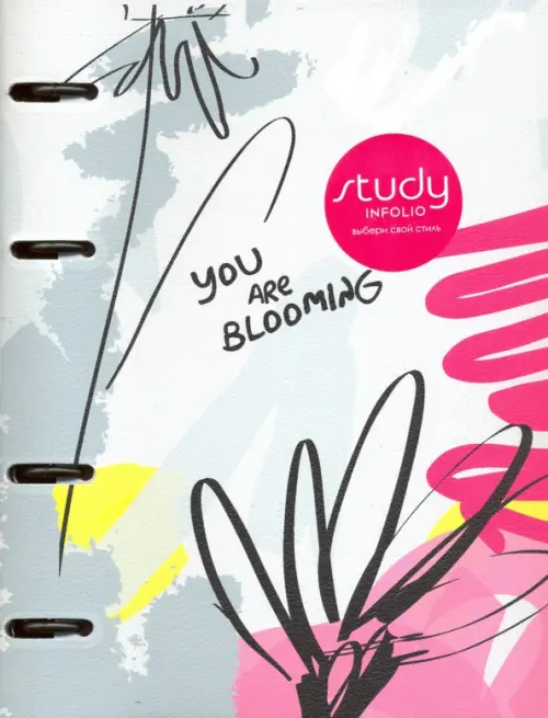 Тетрадь черном кольцевом механизме с печатью интересного дизайна, напоминающего зарисовки цветов маркером от руки.