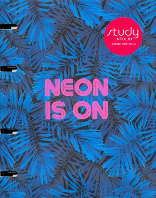 Тетрадь на черном кольцевом механизме с печатью оригинального дизайна, где неоновая типографика стильно сочетается с тропическими мотивами.