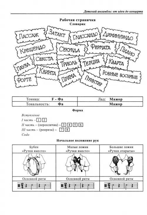 Автор описывает свой опыт по созданию детского ансамбля, заостряет внимание на психологических особенностях ансамблевой игры, дает советы начинающим педагогам по вопросу обучения детей игре на различных инструментах, имеющихся, как правило, в любом детском учреждении (бубнах, ложках - больших и маленьких, ксилофонах, металлофонах). В ансамбле могут участвовать все дети с пятилетнего возраста. Дети общаются, раскрепощаются, прививается "железное" чувство ритма, хорошее сценическое самочувствие. Книга предназначена в первую очередь для преподавателей детских музыкальных школ, а также музыкальных работников детских садов и общеобразовательных школ.