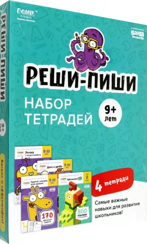 - "Реши-пиши. Развивающая тетрадь для детей 9-10 лет". Увлекательные задания для ребят постарше! Алгоритмы, логическое мышление, дроби, внимательность.