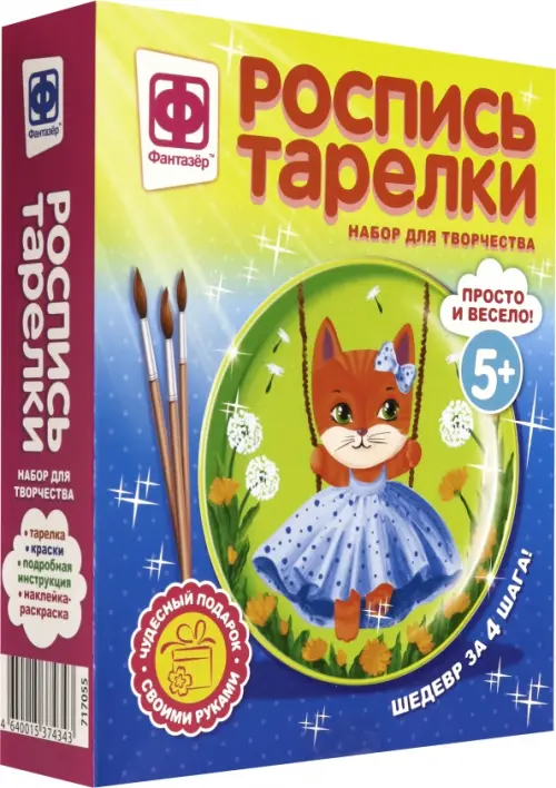 В наборе: пластиковая тарелка, краски, кисть, наклейка-раскраска, инструкция.