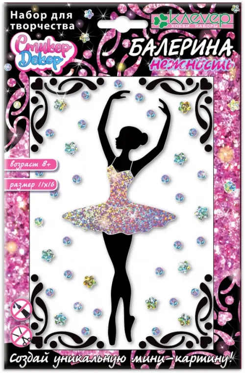 В мини-картинах серии «Балерина» волнующий образ изящной балерины в блестящей пачке в окружении сверкающих огней и ажурных виньеток раскрывается через оригинальное сочетание материалов - матового полупрозрачного пластика, глянцевой чёрной плёнки- самоклейки и искрящиеся голографические стикеры. Попробуйте себя в декоративном творчестве, создавая мини-картины из серии «Балерина». По желанию, вставьте картины в рамки для фотографий.