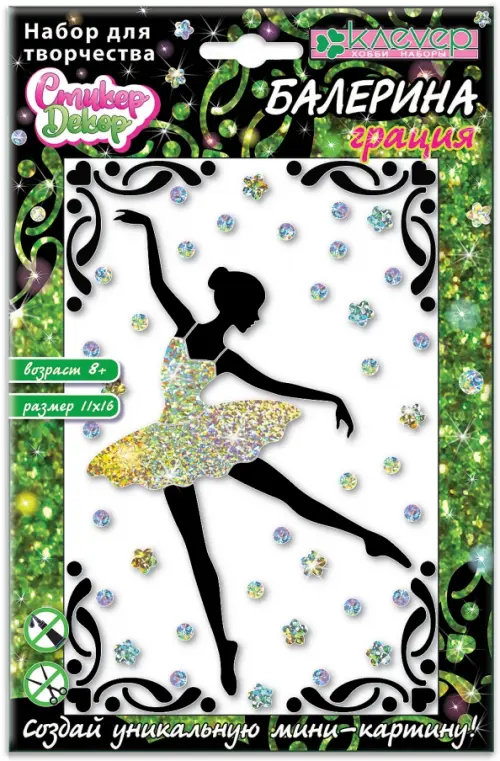 В мини-картинах серии «Балерина» волнующий образ изящной балерины в блестящей пачке в окружении сверкающих огней и ажурных виньеток раскрывается через оригинальное сочетание материалов - матового полупрозрачного пластика, глянцевой чёрной плёнки- самоклейки и искрящиеся голографические стикеры. Попробуйте себя в декоративном творчестве, создавая мини-картины из серии «Балерина». По желанию, вставьте картины в рамки для фотографий.