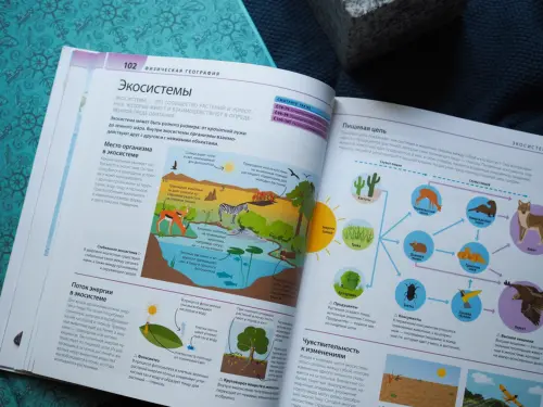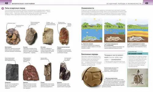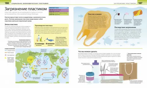 — как происходят землетрясение, извержение вулкана, горообразование, выветривание и эрозия, круговорот воды в природе, как образуется водопад, как горный ледник и морские волны меняют рельеф, как люди укрощают реки, как вьюрки помогли Дарвину сформулировать теорию эволюции, как подсчитать плотность населения, как устроена экономика и ее основные секторы, как добывают ископаемое топливо, как развиваются технологии, как изменилась деревня, как связана деятельность человека и глобальное потепление, как уменьшить потребление пластика, как работает GPS;