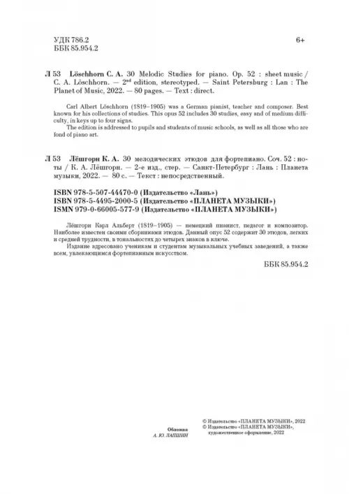 Лёшгорн Карл Альберт (1819–1905) – немецкий пианист, педагог и композитор. Наиболее известен своими сборниками этюдов. Данный опус 52 содержит 30 этюдов, легких и средней трудности, в тональностях до четырех знаков в ключе.