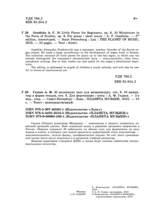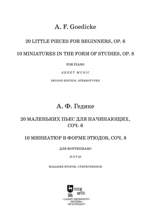 Гедике (Гёдике) Александр Фёдорович – композитор и педагог, основатель советской органной школы. Внес огромный вклад в развитие органного творчества в России. Сборник содержит 20 небольших по объему пьес для фортепиано до двух знаков в ключе, в которых уже можно различить характерный стиль композитора – монументальность, четкую форму, полифоническое письмо. За счет этого произведения также легко могут вписаться и в органный учебный репертуар.