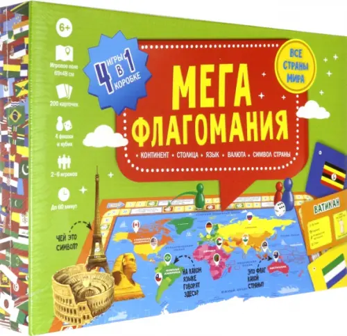 Продолжение легендарной игры "Флагомания". Теперь изучать географию можно с азартом и радостью. Для этого есть все, что нужно: 4 сценария игры, карточки с флагами всех 197 стран и большая ламинированная карта мира. Риск, стратегия, новые знания и радость от кругосветного семейного путешествия – это новая настольная игра "Мегафлагомания"!