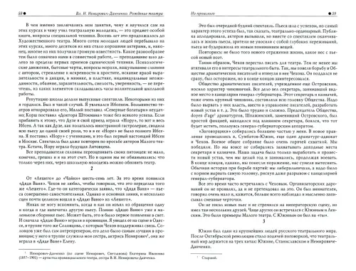 Книга работ крупнейшего теоретика и практика театра В.И. Немировича-Данченко включает его статьи, выстраивающие завершенную режиссерскую концепцию. Для теории и практики театра чрезвычайно важны: разработанное Немировичем-Данченко учение о синтезе «трех восприятий» (социального, психологического и театрального), в слитности которых он видел непреложное условие подлинного творчества, о «втором плане сценической жизни актера» и о «зерне» образа (близкое учению о «сверхзадаче» Станиславского), о «мужественной простоте» и о «физическом самочувствии» и т.д., позволяющие выстроить четкое художественное целеполагание, уверенность психологической разработки образов, точность формы. Немировичу-Данченко было свойственно безошибочное понимание стиля автора, блестящее умение работать с актером. Особый интерес вызывает работа Немировича с музыкальными театральными формами в созданном им в 1919 году Музыкальном МХАТе, носившая во многом экспериментальный характер. Немирович-Данченко добивался гармонии всех элементов сценического произведения, внутреннего единства всего видимого и слышимого, обусловленного музыкой. Он решительно разрушал оперные штампы, воспитывал актера, в равной мере владеющего драматическим и вокальным мастерством («поющего актера»). В своих постановках он разрабатывал различные формы музыкального спектакля, по-новому и смело решая важнейшие принципиальные вопросы оперного искусства (напр., разнообразное понимание хора). Режиссер обновлял в ряде случаев драматургическую основу опер, возвращая ей драматическое театральное начало. Основную задачу театра Немирович-Данченко видел в создании современной оперы. Для студентов творческих, а также всех гуманитарных специальностей.