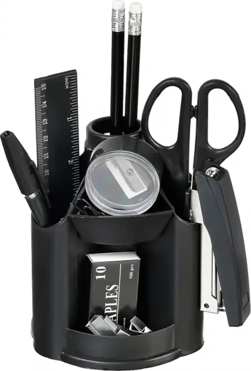 подставка, ножницы, линейка, ручка, чернографитный карандаш, степлер, скобы для степлера, скрепки, точилка