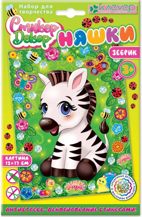Волшебство техники «антистресс-декорирование стикерами» вовлекает в процесс творчества даже самых маленьких детей! Детям от 3-х лет будет несложно создать картину с милым Зебриком: нужно наклеить стикеры-полоски на изображение персонажа на фоне, затем заполнить пространство вокруг него яркими стикерами-цветами, листьями, насекомыми, украсить голографическими сверкающими элементами, - и замечательная картина в солнечных летних красках готова!
