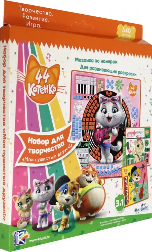 Набор для творчества "44 Котенка. Мои пушистые друзья". Пушистые герои мультфильма "44 котенка" точно знают толк в веселье! Добавь яркие акценты в их музыкальную вечеринку - раскрась картинки-основы по номерам, укрась их разноцветными стразами и увидишь, каким ослепительным может быть творчество! Отличный тренажер для развития мелкой моторики, креативности и фантазии! В наборе: 3 картинки (20х20 см), самоклеящиеся элементы, стразы. Материалы: картон, бумага, полимерные материалы. 340 деталей. Не предназначено для детей младше 3-х лет, содержит мелкие детали.