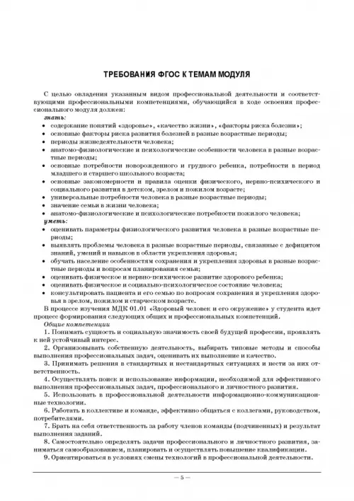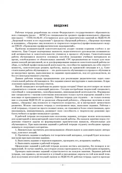 Рабочая тетрадь подготовлена в соответствии с действующим Федеральным государственным образовательным стандартом для студентов среднего профессионального образования по специальности «Сестринское дело» и примерной программой ПМ. 01 «Проведение профилактических мероприятий» МДК 01.01 «Здоровый человек и его окружение». Пособие соответствует требованиям ФГОС по профессиональному модулю, перечень компетенций. Каждое практическое занятие содержит разнохарактерные задания для всех его этапов: проверка исходного уровня знаний, актуализация и закрепление учебного материала – вопросы, тестовые задания, ситуационные задачи, творческие задания. Тетрадь включает богатый иллюстративный материал, таблицы, схемы, эталоны ответов к заданиям. Издание предназначено для студентов медицинских училищ и колледжей.