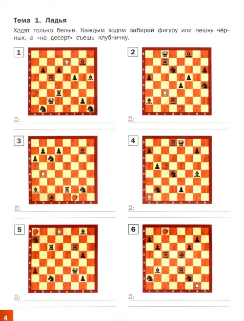 В настоящем сборнике предложены дополнительные задания к курсу «Шахматная школа. Первый год обучения», предназначенные для выполнения в школе на уроке и во внеурочное время в качестве домашнего задания. Представленные 156 примеров помогут ученикам лучше освоить все основные темы начального этапа обучения шахматной игре: ходы и ценность фигур, нападение и защита, шах и мат, элементарная тактика. Внутри каждой темы на каждой отдельной странице примеры располагаются по степени возрастания сложности. Ответы на все задания приведены в конце сборника.