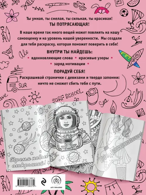 Так много всего может пошатнуть нашу самооценку и сбить в пути. Очень важно уметь любить и ценить себя и не потеряться среди огорчений. Мы подготовили для тебя уникальный продукт: раскраска – мотиватор, которая придаст тебе сил и вдохновит на новые свершения! Отличный способ поверить в себя, преодолеть свои комплексы и перестать следовать за тем, что навязывает социум. 80 страниц, наполненных позитивом, раскроют тебя с новой стороны. Полезный и веселый подарок для каждой девушки! Ты умная, смелая и потрясающая – или даже все сразу! Выбери понравившийся разворот и погрузись в медитативный процесс раскрашивания.