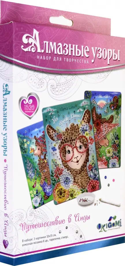 Веселые ламы приглашают в путешествие по бескрайним Андам! Укрась 3 солнечные картинки с пушистым семейством лам блестящими алмазами и составь из них ослепительную композицию или подари друзьям в качестве необычных открыток!