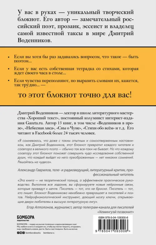 Если вы обнаружили ошибку в описании товара «Ключи и подсказки. 28 авторских уроков. Блокнот с заданиями для поэтов и писателей от Д. Воденникова» (авторы: Воденников Дмитрий Борисович), то выделите её мышкой и нажмите Ctrl+Enter. Спасибо, что помогаете нам стать лучше!