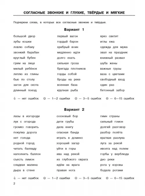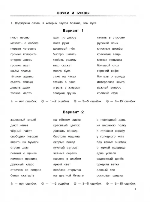Материал пособия построен таким образом, что за короткое время позволяет учащимся отработать все основные орфограммы, а учителю – проверить их знания. После каждого варианта заданий приведена строка со смайликами и соответствующим количеством допущенных ошибок, которая поможет ученику после проверки работы оценить уровень своих знаний.