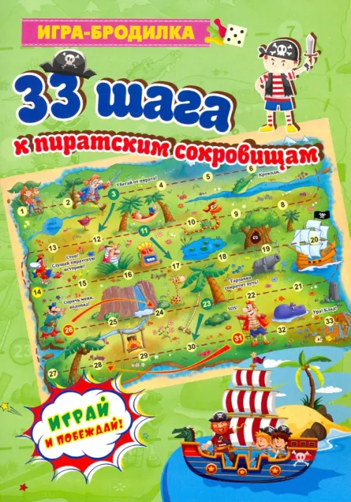 Настольные игры - развлечение на все времена. В них играли еще ваши бабушки и дедушки. И сейчас это занятие вновь пользуется необыкновенной популярностью. А все потому, что оно помогает организовать увлекательный досуг, обеспечивает живое общение детей и взрослых, развивает внимательность, коммуникативность, логическое мышление. Да и просто очень разнообразит ваш досуг. Играя, ребёнок учится считать, соблюдать правила, взаимодействовать с другими игроками, принимать победы или поражения. Если Вам и Вашему ребёнку хочется разнообразить своё времяпровождение, весело и интересно провести время дома, на отдыхе, в путешествии, во время каникул, игра-бродилка "33 шага к пиратским сокровищам" как нельзя кстати подойдёт для разнообразия вашего досуга! Захватывающие приключения на пиратском острове, поиск сокровищ, "ловушки" от коварных пиратов порадуют и детей, и взрослых интересным и динамичным сюжетом, увлекут духом соперничества, желанием преодолеть препятствия, двигаясь вперёд, выполняя условия игры. Проводите время весело и интересно, стремитесь к победе, с достоинством принимайте поражения, радуйтесь и своей победе, и победам друзей-соперников! Вперёд на поиски пиратских сокровищ Предназначено для 2-4 игроков. Состав игры: игровое поле, 4 фишки, 1 кубик.