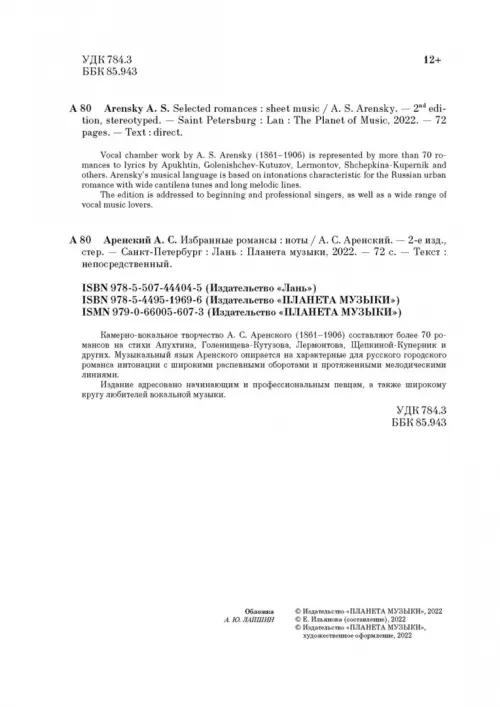 Если вы обнаружили ошибку в описании товара «Избранные романсы. Ноты» (авторы: Аренский Антон Степанович), то выделите её мышкой и нажмите Ctrl+Enter. Спасибо, что помогаете нам стать лучше!