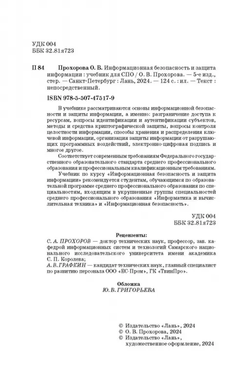 Если вы обнаружили ошибку в описании товара «Информационная безопасность и защита информации. Учебник для СПО» (авторы: Прохорова Ольга Витольдовна), то выделите её мышкой и нажмите Ctrl+Enter. Спасибо, что помогаете нам стать лучше!