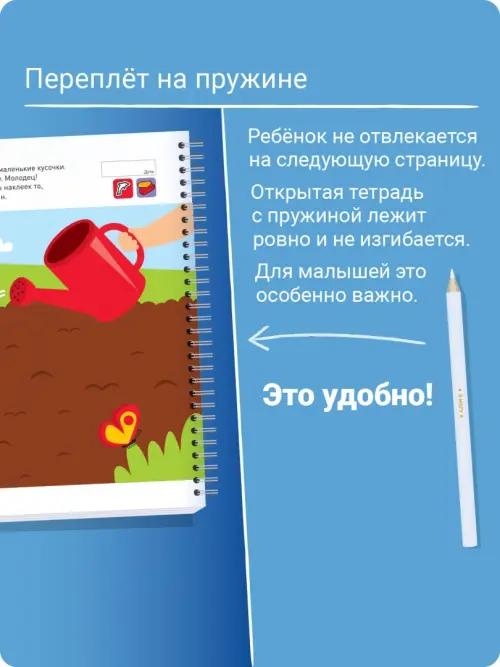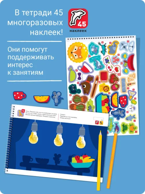 А ещё в нашей тетради есть лист с 45 наклейками, которые так любят дети. Заламинированные многоразовые наклейки можно переклеивать, не боясь их случайно порвать.