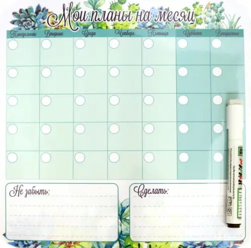 Плоский магнитный планер поможет визуализировать ваши планы на календарный месяц по дням. Его удобно поместить на холодильник или магнитную доску. Записи и пометки следует вносить маркером. Когда ваши планы всегда перед глазами, воплотить их в жизнь значительно легче!