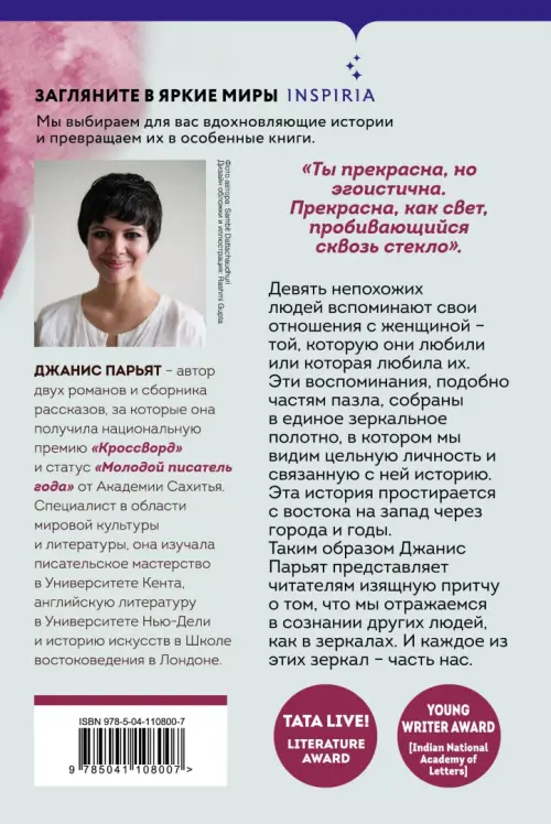 Девять непохожих людей вспоминают свои отношения с женщиной – той, которую они любили или которая любила их. Эти воспоминания, подобно частям паззла, собраны в единое зеркальное полотно, в котором мы видим цельную личность и связанную с ней историю. Эта история простирается с Востока на Запад через города и годы. Таким образом Джанис Парьят представляет читателям изящную притчу о том, что мы отражаемся в сознании других людей, как в зеркалах. И каждое из этих зеркал – часть нас.