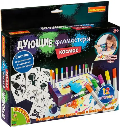В наборе: 12 фломастеров, 8 трафаретов, 10 листов бумаги.