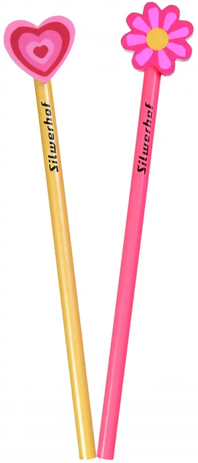 Набор чернографитовых карандашей с фигурными ластиками SILWERHOF LOVELY состоит из желтого и розового карандаша с ластиками в виде цветка и сердечка. Таким набором легко и удобно писать и рисовать. Если необходимо что-то исправить - ластик всегда под рукой. Корпус карандашей имеет круглую форму, имеет ударопрочный грифель твердости НВ. Карандаши не заточены.