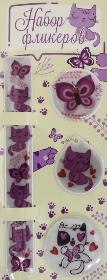 Набор светоотражателей состоит: браслет слэп, брелок/фликер, мягкая наклейка, закатной значок диаметром 56 мм.