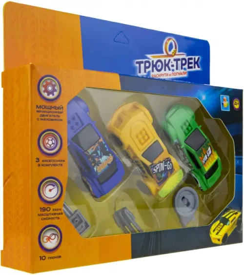 Состав набора: 3 машинки, аксессуар для трюков, 2 декоративных аксессуара.