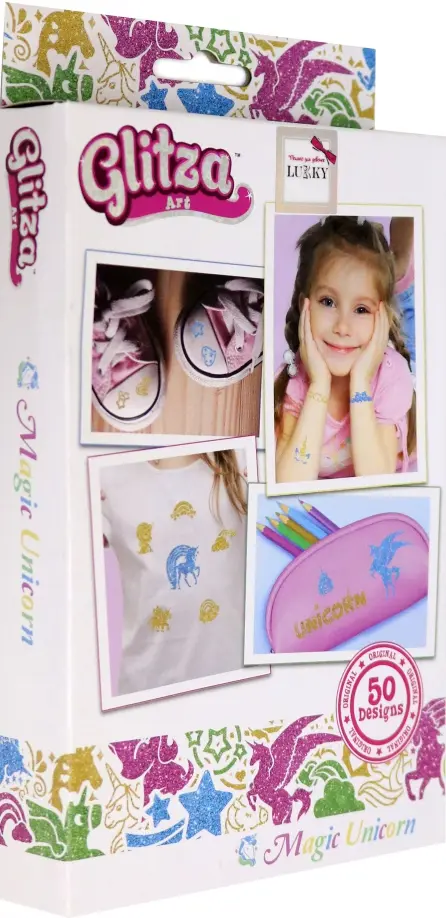 Уникальные тату от Glitza Art Lukky, для которых не нужны ни вода, ни утюг, ни клей. Просто прижми, переведи и смахни! Просто добавь блёсток и создай настоящую магию! Новая потрясающая возможность попробовать создать свой неповторимый стиль. 50 видов единорогов на любой вкус, которых можно разместить не только на твоей коже, но и почти на любой поверхности вокруг. Пусть единорогов и не существует, у тебя будет такой, и не один! Очень мелкие, но яркие блестки отлично подчеркнут твоё исключительное чувство стиля, будут блестеть даже под водой и держаться до 5 дней. В набор входит 2 листа с 50 клейкими дизайнами, 2 баночки с блестками (золотого и голубого цветов) по 1 г и кисточка. А при необходимости тату легко смоются водой и мылом.