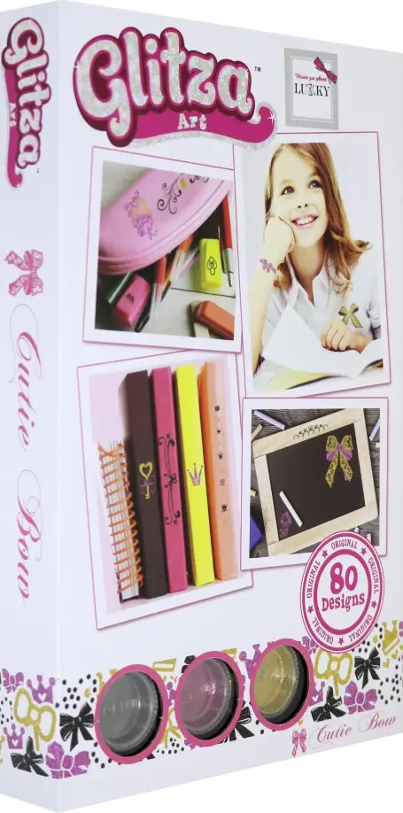 Уникальные тату от Glitza Art Lukky, для которых не нужны ни вода, ни утюг, ни клей. Просто прижми, переведи и смахни! Просто добавь блёсток! Классика с нотками твоей индивидуальности - новая потрясающая возможность попробовать создать свой неповторимый стиль. 80 видов бантиков на любой вкус, которые можно разместить не только на твоей коже, но и почти на любой поверхности вокруг. Очень мелкие, но яркие блестки отлично подчеркнут твоё исключительное чувство стиля, будут блестеть даже под водой и держаться до 5 дней. В набор входит 2 листа с 80 клейкими дизайнами, 3 баночки с блестками (черного, розового и золотого цветов) по 1 г и кисточка. А при необходимости тату легко смоются водой и мылом.