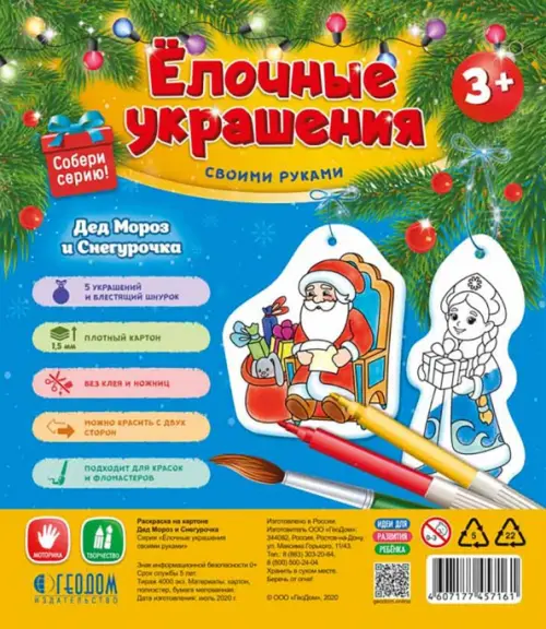 Как красиво смотрятся на ёлке игрушки, сделанные своими руками! Теперь это можно легко и быстро организовать. С нашим набором ребёнок сможет раскрасить уже готовые изображения Деда Мороза, Снегурочки, милых и очаровательных зверей. Нужно просто выдавить двухстороннюю фигурку из основы, раскрасить и привязать яркий праздничных шнурок. И всё! Игрушка на ёлку готова! В набор входит 5 замечательных фигурок и блестящий шнурок. Раскрашивать можно и фломастерами, и красками.