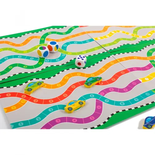 Хотите принять участие в настоящем ралли? Тогда скорее доставайте из коробки гоночную трассу, фишки-машинки и кубики и готовьтесь к старту. Выберите карту с дорожкой любимого цвета или постройте длинную трассу из четырёх карт и меняйте цвет дорожки по пути.